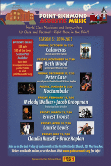 December 12 - Peter Case with special guests Claudia Russell and Bruce Kaplan January 10 - Noctambule with special guests TBA February 13 - Melody Walker and Jacob Groopman March 13 - Ernest Troost with special guest Laura Zucker April 10 - Laurie Lewis - plus special guests May 12 - Claudia Russell and Bruce Kaplan with special guests Jil Freeman and Joel Wachbrit