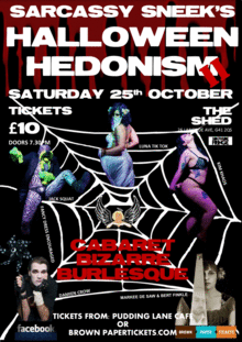 t's that time of year again where things go bump and in the night. Join Sarcassy and her Halloween Hedonists for a hauntingly hot homage to all hallows eve. The hedonistic hostess has summoned up an internationally delectable eclectic gaggle of ghouls, guys and gorgeous gals just for your gruesome entertainment. Returning to The Shed, their spiritual home, or should that be home of spirits, you're guaranteed a night of giggles, gasps and good gawds how did they do that. Back by popular demand grumpy Goth Damien Crow reluctantly lets us into his miserable life, Kim Khaos brings glammer to the stage with her hot hammer, Markee De Saw and Bert Finkle make an uneasy dream, with luscious Luna Tik Tok all may not be what it seems and Jack Squat brings his peculiar puppetry to the party.