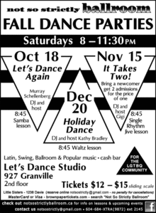 Join us the third Saturday of the month for Vancouver's only GLBTQ ballroom and latin dance party. Free dance lesson at 845 pm - this month host and instructor Murray Schellenberg will be teaching some Samba moves suitable for both beginning and advanced dancers.