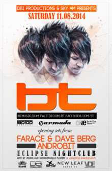 DBI Productions & Sky AM are proud to announce that Grammy nominated composer & technologist - BT - returns to Jacksonville in over 3 years! BT is one of the biggest producers the electronic music world has ever seen! Get ready for amazing music all night!