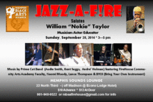 This September's Jazz-A-FIRE performers include The Prime Cut Band with pianist Audie Smith, drummer Andre' Holman, singer Frank Phillips and will be joined by fellow Prime Cut bassist, & FireHouse Community Arts Academy faculty & musical director Kent Suggs. Other professional music faculty of the FireHouse Community Arts Academy, vocalist Naomi Williams Moody, and guitarist, Lance Thompson will be featured. Amateur and professional jazz musicians and singers are invited to BYOI (Bring Your Own Instrument) and sit in and jam with the musicians during the final hour. Donations are $10 in advance; $12 at the door. For more information call 901-948-9522.