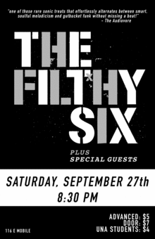 "The music of The Filthy Six is one of those rare sonic treats that effortlessly alternates between smart, soulful melodicism and gutbucket funk without missing a beat! Their recent show in Birmingham was one of the highlights of my concert calendar this past spring and was a real showcase for their ultra-hip, modern take on what is - for all intents and purposes - a very retro sound. One of my new favourites" - The Audiovore - Birmingham Mountain Radio AL (USA)