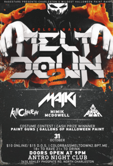 Rage Stars is back with the 2nd big installment "Color Bass Meltdown 2"! We had a huge turnout for the first one & decided to bring it back & have it on Halloween night! For this we are bringing in even more washable paint with Halloween colors (ORANGE, BLACK & YELLOW). Cash prize will go to the best costume in the middle of the night. The paint will drop after the custome contest is announced. We have the bass hitting & special talented producer/headliner of the night "MAIKI" who's going to be taking on this crazy Halloween event with all sorts of madness he's prepared in his set! THIS WILL BE INDEED A INSANE SHOW! He will be supported by hand picked electronic artist that are planning there scary but bass dropping sets for the night. Get ready for the 2nd biggest paint party that Rage Stars has ever thrown! BUY TICKETS AT http://colorbassmeltdown2.bpt.me