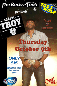 The Godfather of 'Hick Hop', Cowboy Troy has toured and recorded with Big and Rich from their start. On October 9th, Cowboy Troy along with D.J. Sinister, take over the stage at the Rocky-Tonk in Medford Or. We welcome them back by popular demand. This is their 2nd time at the Rocky-Tonk and it's gonna be great! The show is 21+