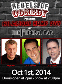 Rebels of Comedy presents Hilarious Hump Days at the Federal Bar in North Hollywood. Come out and see a night of live comedy, featuring an awesome lineup of professional features and headliner comedians. Hosted by Jay Flats with the show's headliners : AJ Trexler, Lou Santini