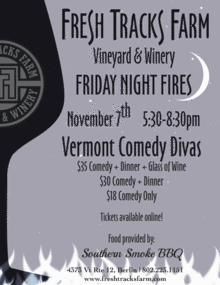 Join us for our Funny Friday Night Fires! We'll be welcoming Hillary Boone, Carmen Lagala, Josie Leavitt, and Sue Schmidt from the award-winning, well-renown Vermont Comedy Divas!