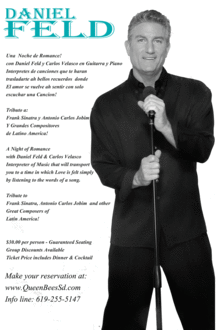 November is here, this weekend is your chance to experience the true magic of Queen Bee's. This is a concert produced by the Queen Bee herself from start to finish. The entertainers and musicians have been handpicked to take you on a delightful journey with songs of the past. Join us for a enchanted evening of live performances by Daniel Feld & Carlos Velasco. This night will be a Tribute to Frank Sinatra, Antonio Carlos Jobim, and other great composers of Latin America.