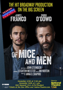 National Theatre Live Presents "Of Mice and Men" Saturday, November 29th at 9:30pm & Sunday, November 30th at 1:00pm Golden Globe winner and Academy Award nominee James Franco (127 Hours, Milk) and Tony Award nominee Chris O'Dowd (Bridesmaids, Girls) star in the hit Broadway production Of Mice And Men, filmed on stage by National Theatre Live. This landmark revival of Nobel Prize winner John Steinbeck's play is a powerful portrait of the American spirit and a heartbreaking testament to the bonds of friendship.