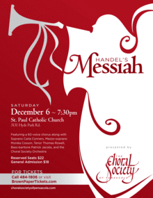 Our traditional holiday performance will feature the 60 singers of the Choral Society of Pensacola, the Choral Society of Pensacola Orchestra, and four excellent guest soloists, all under the baton of Choral Society Artistic Director, Xiaolun Chen.