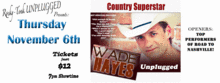 Country Chart Topper Wade Hayes will be performing an unclose and personal acoustic show at the Rocky-Tonk in Medford Or on Thurs Nov 6th. Opening the show will be contestants from our "Road to Nashville" competition. Hayes has had 6 top 10 hits on the billboard charts and 'old enough to know better' went #1 The show is 21+ Thursday night Nov 6th at 7:30 pm