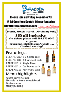 Scotch, Scotch, Scotch...Get in my Belly! Scotch, barely edging out kilts and sheep as Scotland's biggest contribution to the modern world. Long thought to be enjoyed on it's own while laying on a bear rug in front of a fireplace is remarkably just as enjoyable when paired with food. Come experience this phenomenon as we feature some time tested favorites and classics from the Glenfiddich and Balvenie portfolios. On hand to enhance your experience will be Balvenie's Brand Ambassador Jonathan Wingo who might be adding a few surprises on his own. Baraonda, one of Midtown Atlanta's oldest and finest Italian destinations is proud to showcase a selection of these scotches perfectly paired with Chef/Owner Costanzo Astarita's creations.