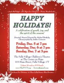 The Falls Village Children's Theater at the Center on Main presents "HAPPY HOLIDAYS!" directed/musical directed by Michael Berkeley, choreography by Amber Cameron and featuring area youth ages 7 - 15.