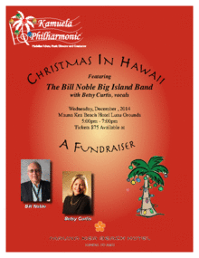 We are having a Christmas celebration at the Mauna Kea Luau grounds with BIll Noble and the Big Island Band WITH Betsy Curtis singing for us.