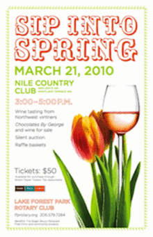 SIP INTO SPRING! Save the date: March 21, 2010 From 3pm to 5pm at the Nile Country Club. Over 12 Vintners present 40 of their favorite fine wines for your sampling. Enjoy delicious Hors d' Oeuvres and Gourmet Chocolates by George. Wines for Sale, Silent Auction and Raffle Baskets. Benefits the Rouger Bouck Rotacare Free Clinic, our local schools, scholarships and many LFP Rotary Foundation projects. Tickets $50 ea, (206) 579-7284 or http://lfprotary.org