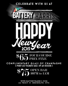 Battery Harris is serving a special Prix Fixe Menu for $65/person with a complimentary champagne toast. ($60 limited release for the first 20 tickets/ $75 at the door)