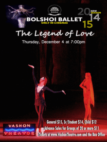 Bolshoi Ballet-THE LEGEND OF LOVE Captured Live-NEW PRODUCTION Thursday, December 4th 7:00pm Running time 3hr