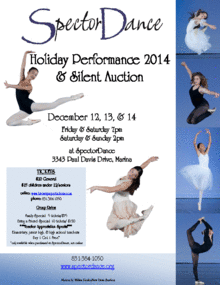 SpectorDance is the place to celebrate the holidays with family and friends. The Silent Auction will feature Disneyland tickets, golf packages, restaurant gift cards, beauty and spa services, original art, gift baskets, jewelry, and more! Make the SpectorDance Holiday Performance & Auction a tradition. TICKETS General $20 Children 12 & under & seniors 65+ $15 GROUP RATES Family Package 5 tickets/$75 Bring a Friend Package 10 tickets/ $120