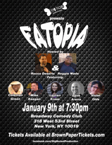 It's all in the name "Fatopia" is a comedy showcase brought to you by Reggie Wade and Rocco Deserto of Big Boned Productions. "Fatopia" will literally and figuratively bring you the biggest up and coming stand up comics on the scene. The show is large and in charge, and will prove that once you go fat, it's pretty hard to go back.