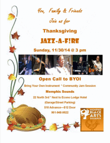 You, Your Friends & Family are invited to join us Thanksgiving Sunday for Jazz-A-F!RE at 3-5 pm at Memphis Sounds, 22 North Third Street at Econo Lddge Hotel. You will experience the finest in straight-ahead jazz music hosted by the Memphis Black Arts Alliance's FireHouse Community Arts Center. The Jazz-A-F!RE Experience which began July 2009 features professional music faculty of the FireHouse Community Arts Academy, including vocalist Naomi Williams Moody, guitarist, Lance Thompson and bass player Kent Suggs, also a member of Prime Cut Band - Audie Smith, piano and Andre' Holman, drums . Amateur and professional jazz musicians and singers are invited to BYOI (Bring Your Own Instrument) and sit in and jam with the musicians during the final hour. You never know who you'll see!!!