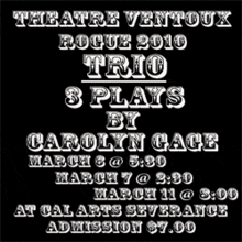 Theatre Ventoux presents three one-act plays by award-winning playwright Carolyn Gage, author of "The Anastasia Trials in the Court of Women": the sentimental "Calamity Jane Sends a Message to Her Daughter", the provocative "A Labor Play", and the downright silly "The Poorly Written Play Festival: Possibly the Worst One-Act Play Ever Written."