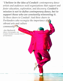 Over the past twenty years Conduit's place in the region has been at the core what makes Portland a growing contemporary dance destination of national stature. Experiencing dance up-close has been a mainstay at Conduit's intimate studio theater since it's opening in 1995. Conduit is a site where contemporary dance is created, rehearsed, were dancers train, and new work is performed. A wide range of talented contemporary dancers and choreographers come to Conduit to study, offer and take workshops, create, rehearse, perform, and see each other's work. Three thrusts of activity, Training, Work Space, and Performance advance Conduit's mission. Conduit aims to create an environment where creative risk, independent career paths, collaborative relationships, diverse practices and presentation of innovative dance can flourish. Conduit additionally provides crucial links to artists and organizations throughout our region and nationally. Conduit Dance believes that art is a dynamic social force that inspires individuals and defines cultures. With its three major thrusts of activity, Conduit greatly shapes regional dance by providing the community with affordable space and the support necessary to promote experimentation and excellence, as well as a central hub for interaction with the performing arts. |